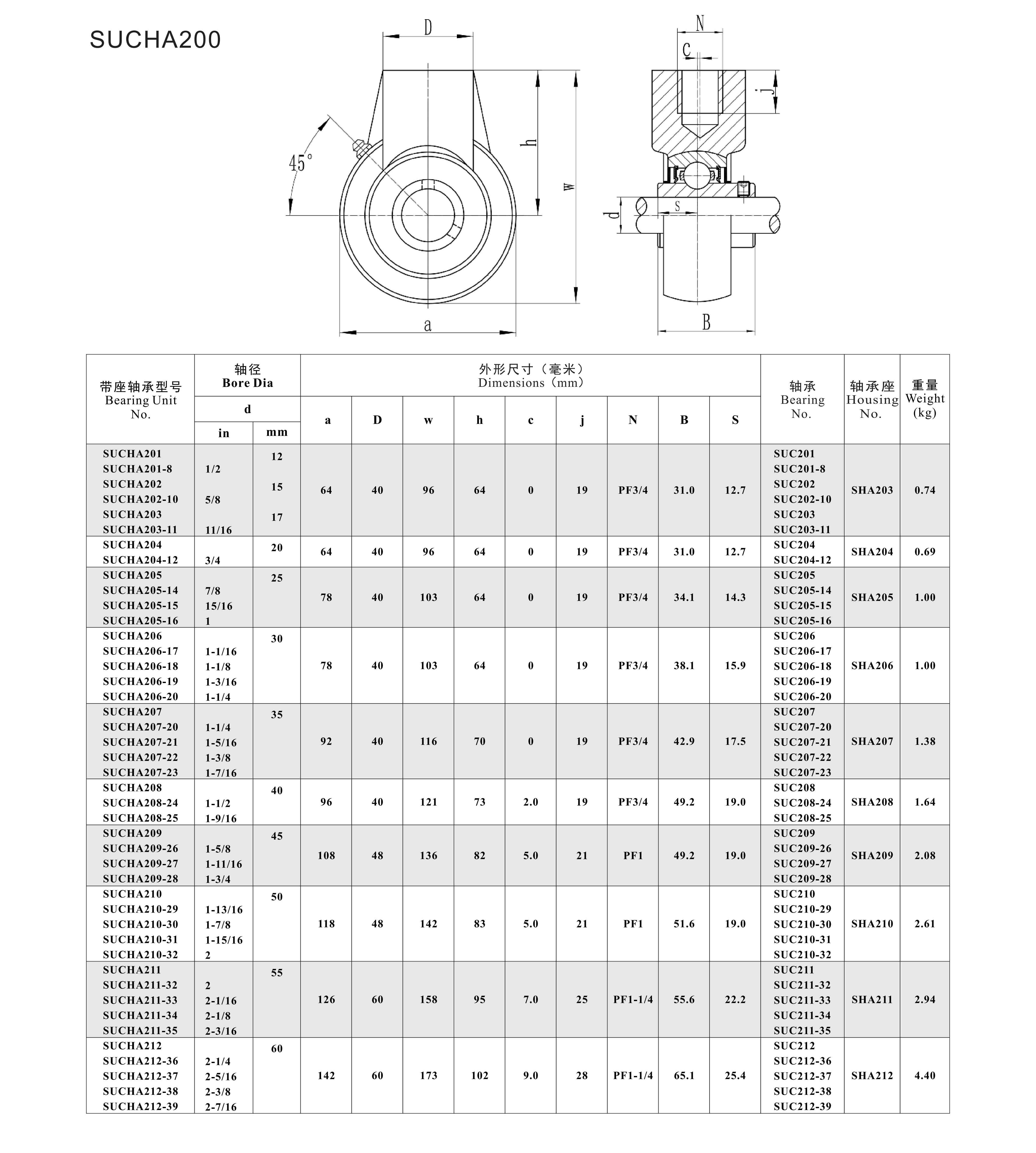 SUCHA200 Series Size Chart